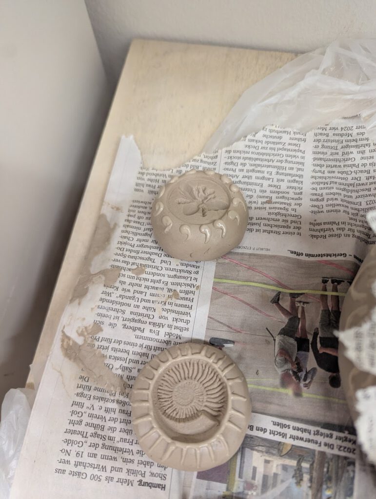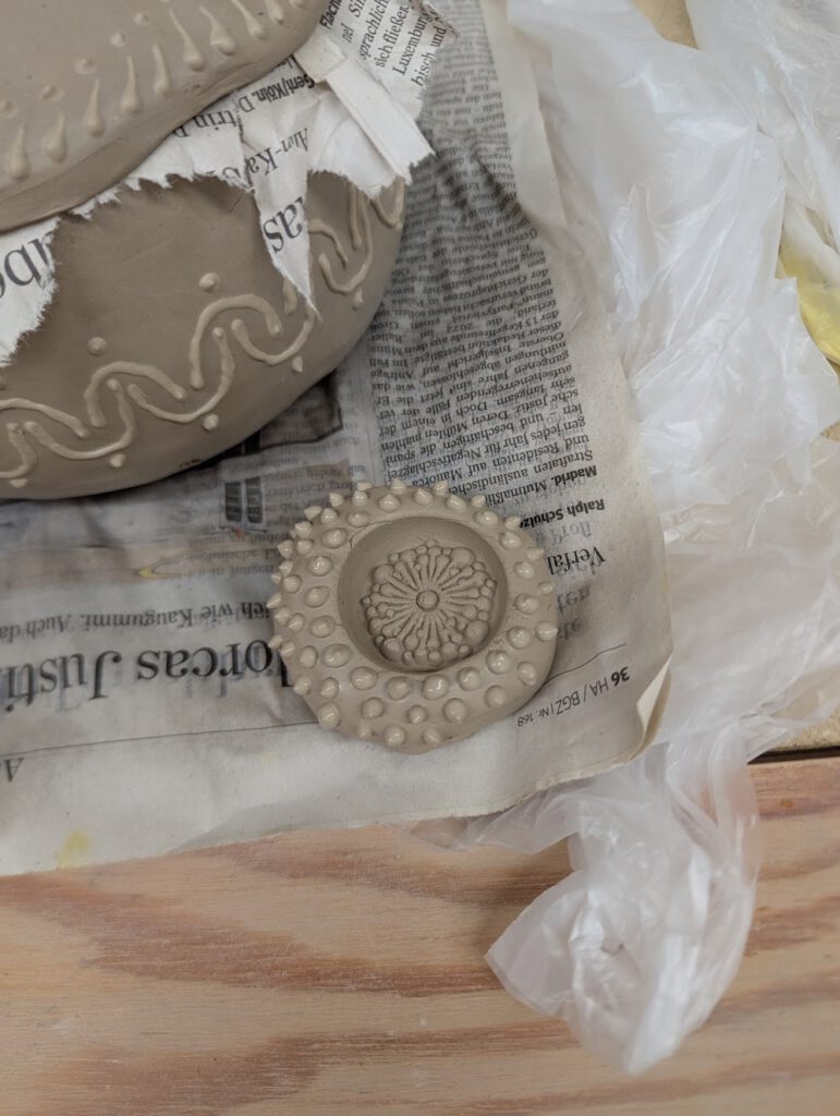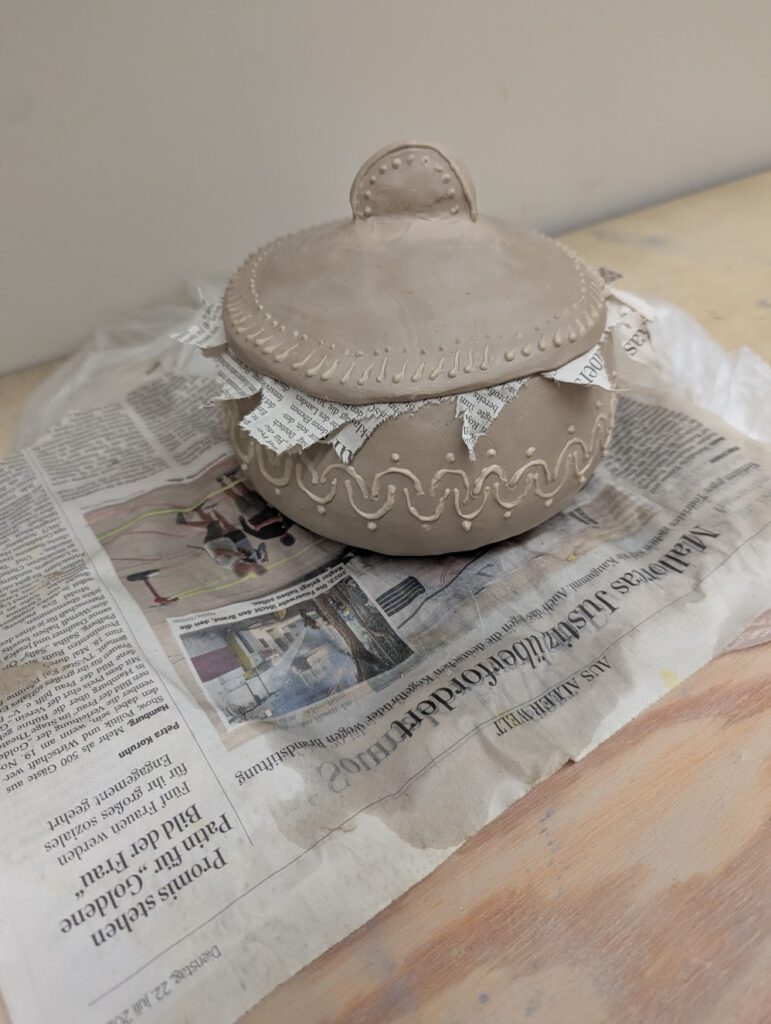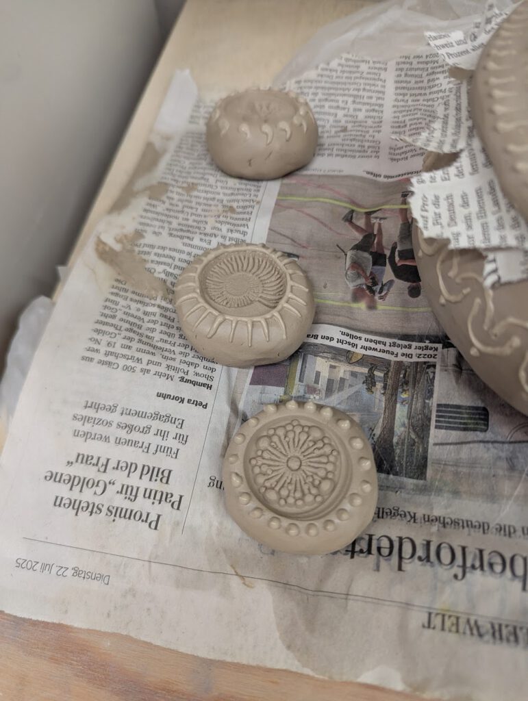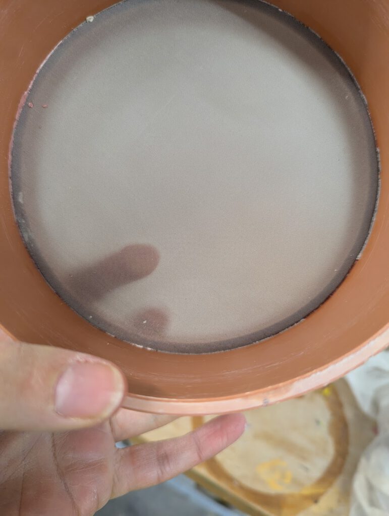 Den Schlicker habe ich vor dem Auftrag durch ein sehr feines Sieb gestrichen, um ihn von groben Steinchen zu befreien. So kann er gleichmäßig durch den Aufsatz fließen und sauber verarbeitet werden.